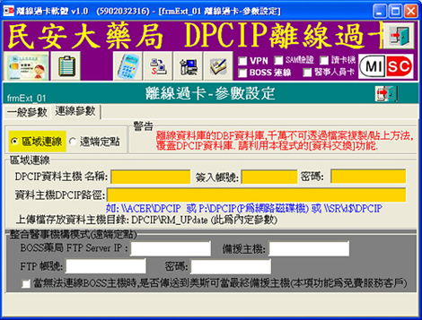 | 1. 在開啟本軟體後,請點選右方圖示,進行參數設定。 2. 請點選「連線參數」,選擇「區域連線」,並將下方必要資料填寫完整, 以便和BOSS電腦做資料整合。 ----------------------------------------------------------------------------------------- |